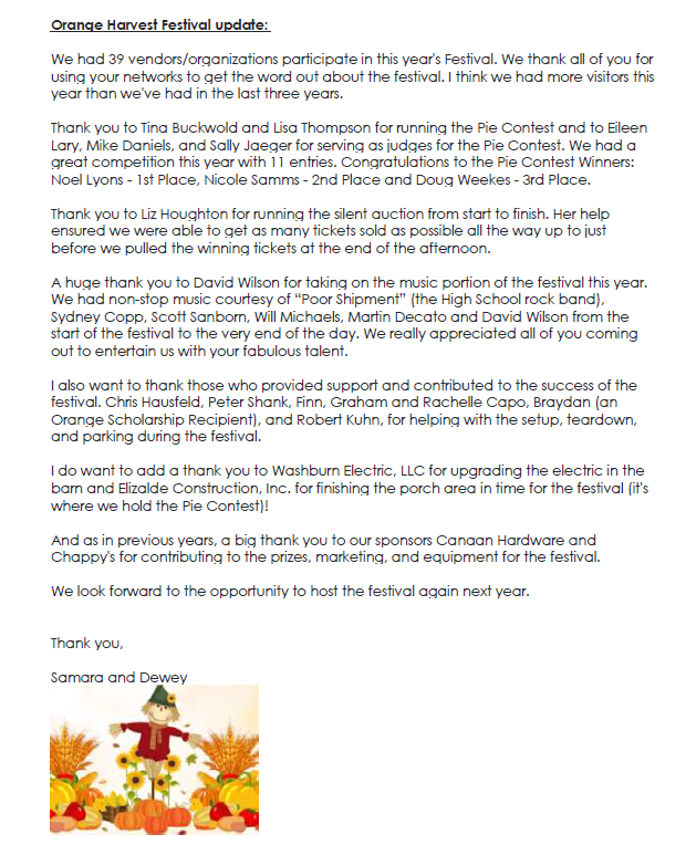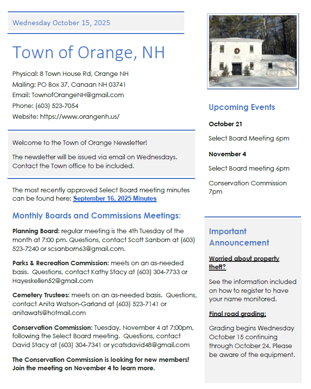 Welcome to the Town of Orange Newsletter. The newsletter will be issued each week on Wednesday.