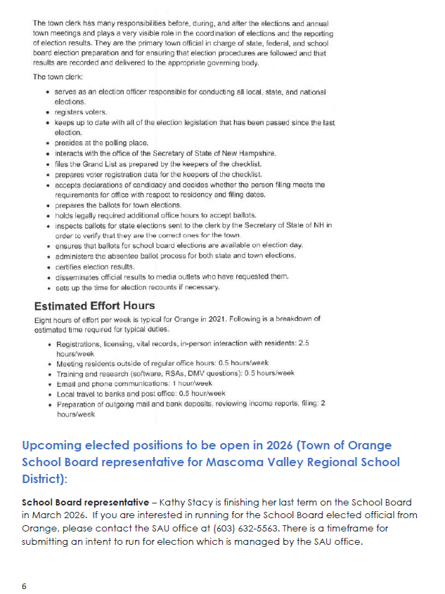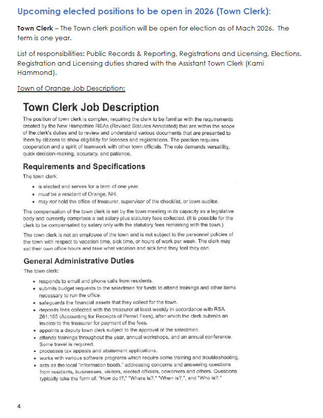 OPEN SELECT BOARD POSITION: At the January 20, 2026 Select Board meeting, Judith Lindahl was appointed to fill the Select Board position until Town Elections in March 2026.