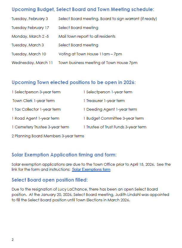 • SOLAR EXEMPTIONS: Solar exemption applications are due to the Town Office prior to April 15, 2026.   See page 2.