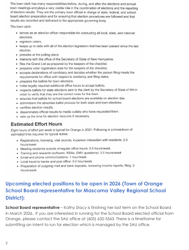 OPEN SELECT BOARD POSITION: Unfortunately, Lucy LaChance has resigned her Select Board position effective end of December 2026. The Select Board will appoint a replacement in January 2026. If you are interested in filling the open position for either the remaining 3 months until Town Elections in March 2026 or for the balance of the term through March 2027, please contact the Town office or Aaron Allen, chair of the Select Board. Further information on page 4.