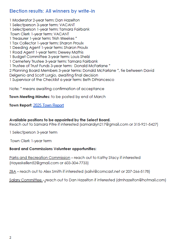 The following positions remain unfilled after the recent elections. If you are interested, please contact Samara Pitre at samaralyn217@gmail.com or 315-921-5427: