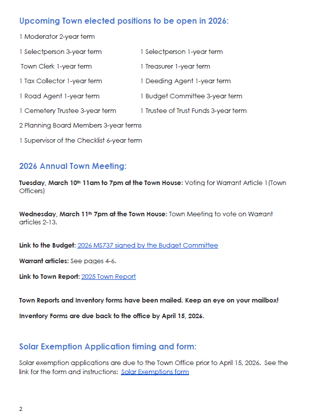 • Solar exemption applications are due at the Town office by April 15, 2026.