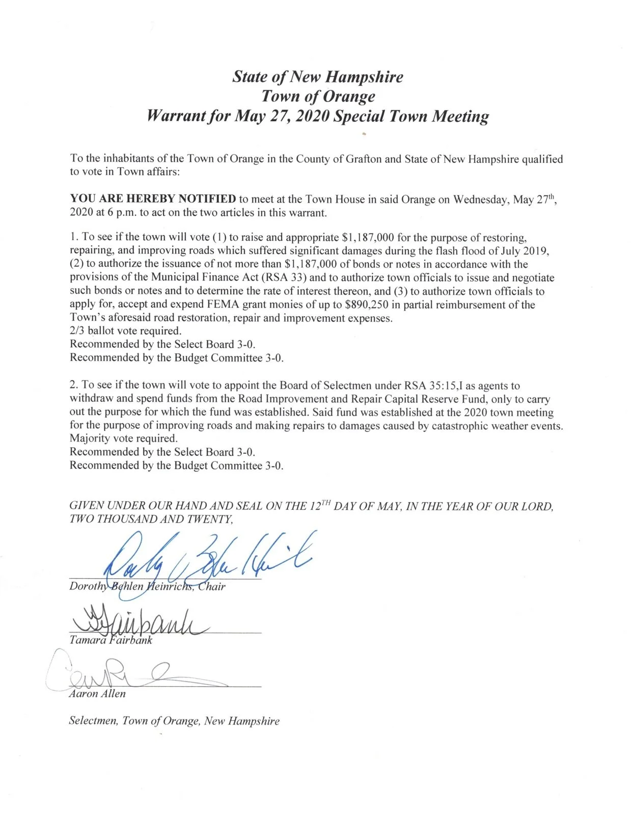 “To see if the town will vote (1) to raise and appropriate $1,187,000 for the purpose of restoring, repairing, and improving roads which suffered significant damages during the flash flood of July 2019, (2) to authorize the issuance of not more than $1,187,000 of bonds or notes in accordance with the provisions of the Municipal Finance Act (RSA 33) and to authorize town officials to issue and negotiate such bonds or notes and to determine the rate of interest thereon, and (3) to authorize town officials to apply for, accept and expend FEMA grant monies of up to $890,250 in partial reimbursement of the Town’s aforesaid road restoration, repair and improvement expenses.”